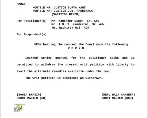 اس پر عدالت نے کہا کہ جب معافی مانگی گئی تب تک بہت دیر ہو چکی تھی۔ اس کے ساتھ عدالت نے نوپور کے خلاف درج مقدمات کو دہلی منتقل کرنے سے انکار کر دیا۔ اس کے بعد ان کے وکیل نے درخواست واپس لینے کی اجازت مانگی تو عدالت نے اسے منظور کر لیا۔ 27 منٹ کی سماعت کے بعد سپریم کورٹ نے نوپور کی عرضی کو تین سطری حکم میں نمٹا دیا۔